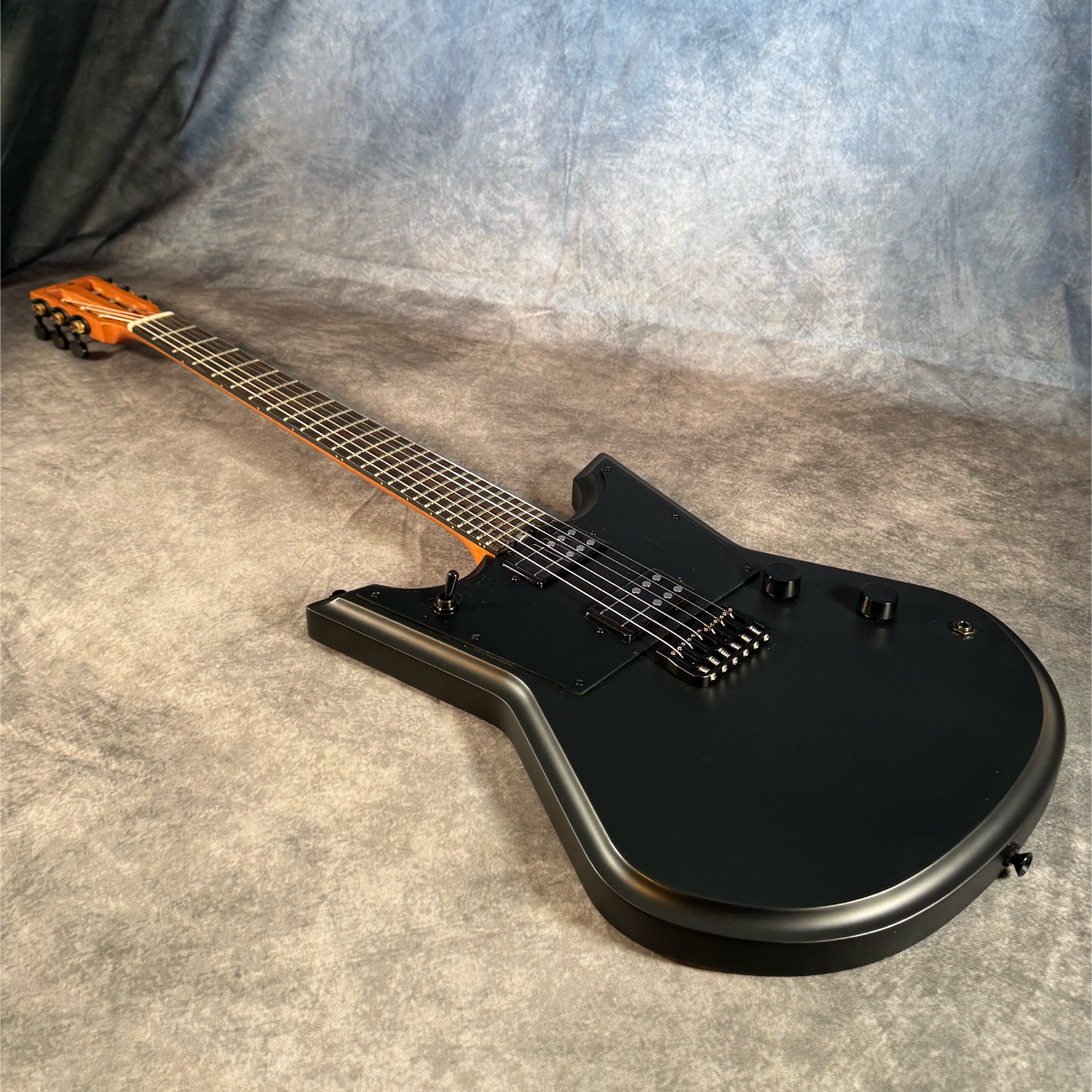 This is a guitar from our Independent Line in black with a black pickguard and black hardware. It has two humbuckers from Railhammer (Hyper Vintage).